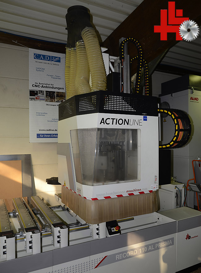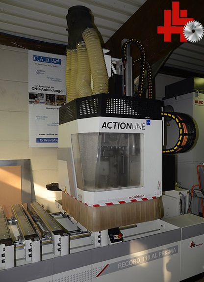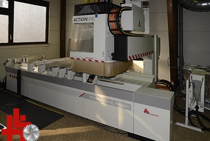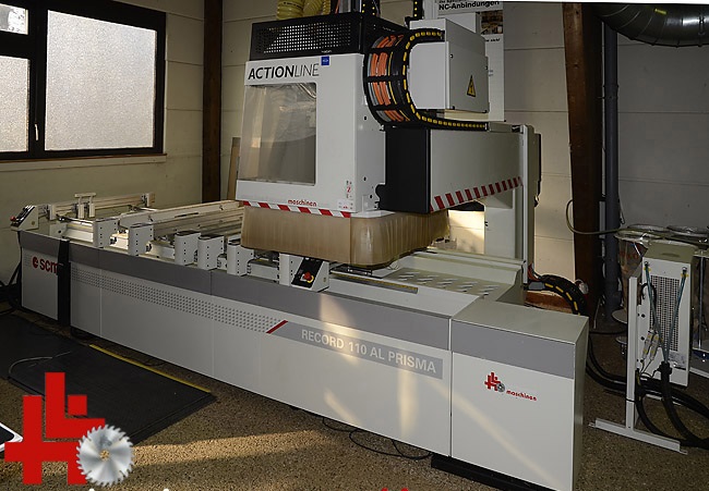 SCM CNC workcenter, type Record 110 TV-Prisma, built in 2007, with cross table, new HF milling spindle (8.5 kW) HSK with Rapid 16-fold tool changer, speed 600 - 24,000 rpm, drill head with 18 spindles, PC control with software, axis range X, Y, Z = 3,500 x 1,815 x 440 mm, working range 3,110 x 1,280 x 200 mm, 6 crossbars with tubeless vacuum suction cup clamping system with cross laser positioning, tread mat system, reinforced 250 m3 vacuum pump, HSK holders and tools, central extraction connection, original price approx. 130.000,- euros,