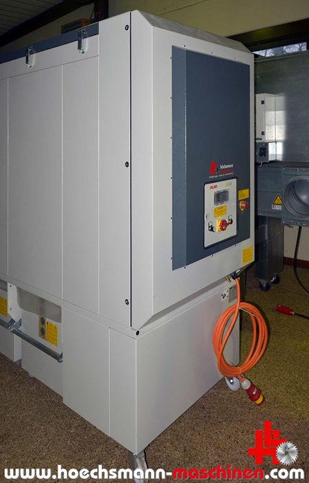 new machine, sound-damped system 71 dB, motor 400 volts - 7.5 kW, suction nozzle Ø = 250 mm, 2 mobile separation containers each 250 ltr., automatic pneumatic controlled filter cleaning (via PLC), incl. automatic extinguishing device, dimensions: L = 2.351 mm, W = 1.058 mm, H = 2.361 mm, weight 758 kg, max. volume flow 5.000 m³ / h, max. negative pressure 3.534 Pa, machine powder-coated, list price including preliminary freight 13.800 Euro, ...
