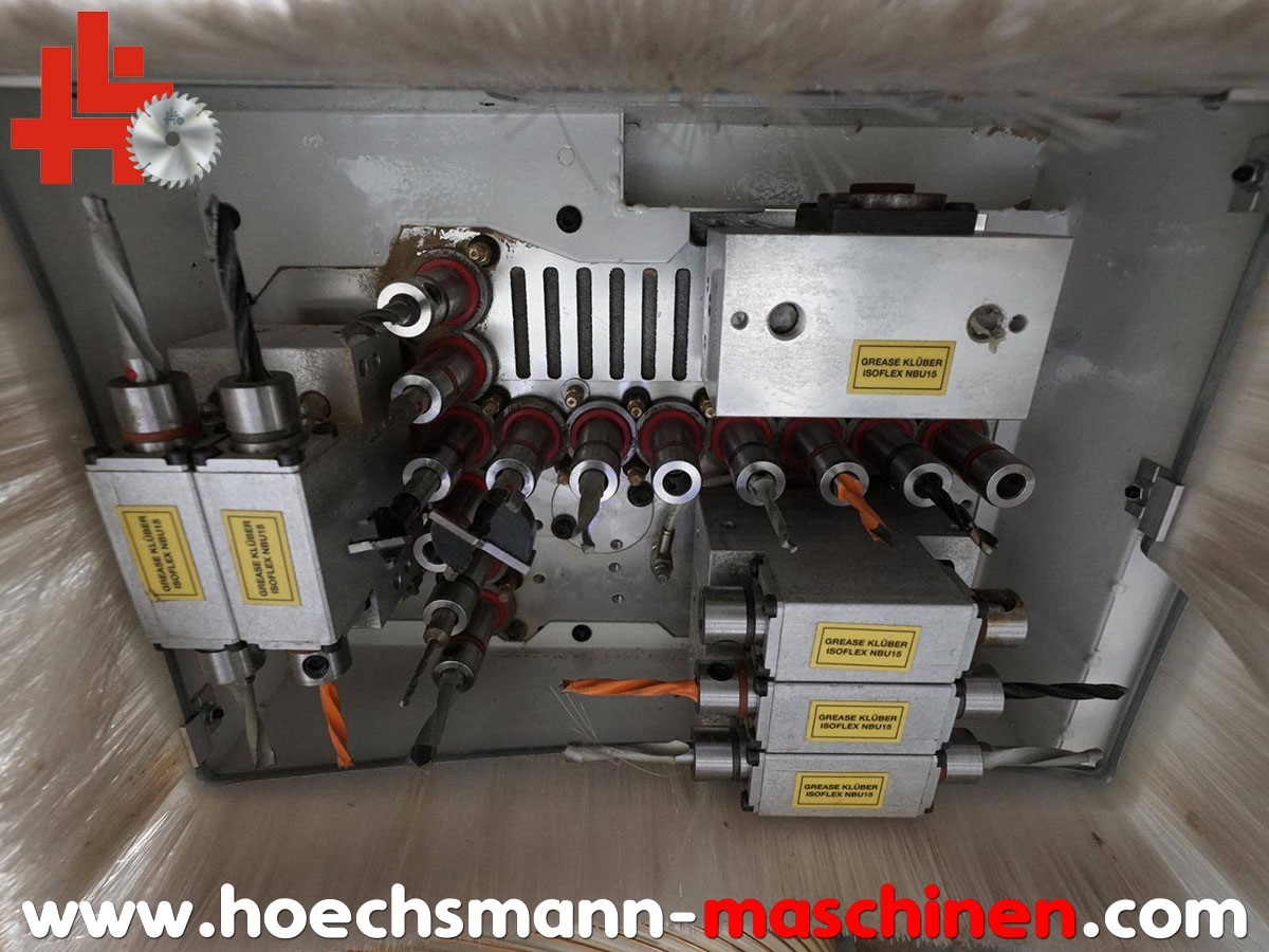 12 kW PRISMA KS milling spindle with HSK-F63 support, torque support, TRB14 tool changer with 14 places on the right side of the machine base, FAST 14 tool changer with 14 places in the protective housing moving along next to the spindle, F23L RO.AX drilling unit with pneumatic vertical positioning (single Z axis), 6 drilling spindles horizontally in X and 4 horizontally in Y, integrated saw blade/grooving saw in X direction,