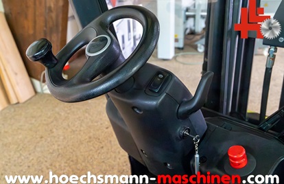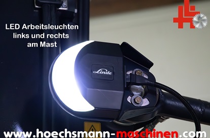 LINDE E 20 EVO forklift truck, built in 2018, drive-through height approx. 2.75 m, 2,000 kg nominal load capacity, unladen weight 2,810 kg, 48 V system, lead batteries approx. 1 .064 kg, two-motor front drive with 2x 5 kW drive power with traction control, patented double pedal control, patented combi-steering axle (combines the maneuverability of a three-axle with the stability of a four-axle), integrated digital scales, triplex mast with free lift, max. Lifting height 5.40 m, top-mounted tilt cylinder for mast stability and greater leverage, sideshift and fork positioner, fork length 1,930 mm, glass roof, multifunction color display for displaying mast tilt in degrees and the weight of the integrated weighing device, time, remaining charge indicator or remaining battery time and much more, LED display for battery status, Linde Truck-Spot warning sign projection on the floor behind the vehicle, onboard high-frequency charger, active ventilation of the battery saves opening the battery cover when charging, LED work lights on the left and right of the mast + work light to the rear, Linde BlueSpot LED route warning device valid UVV until 07/2024, preparation for Linde fleet management system connect, top condition, current list new price over 60.000,- Euro