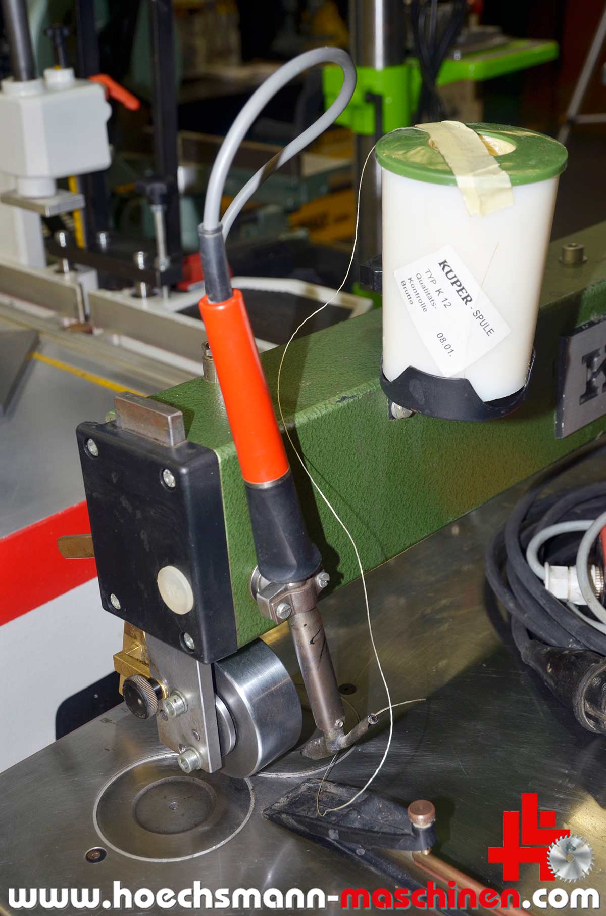 Kuper veneer splicing machine FWM 630 Mini, built in 1987, with glue thread, passage width 630 mm, with foot switch