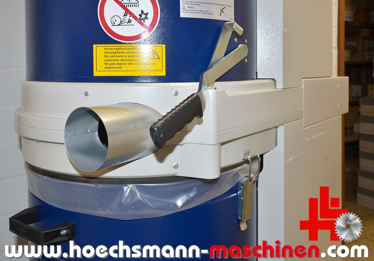 Holzkraft RLA 1103 dust collection unit, built in 2022, CE mark, extraction nozzle 100 mm, max. volume flow 790 m³/h, nominal volume flow 565 m³/h, negative pressure 2124 Pa, filter surface 4.1 m², chip collection volume 135 l, residual dust content < 0.1 mg/m³, motor 1.5 kW/ 400 V, dimensions (LxWxH) approx. 1178x650x1973 mm, weight 116 kg