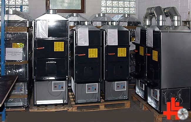 01 hot air supply nozzle, 02 door for manual charging, 03 control door for ash extraction, 04 waste disposal grate, 05 air extraction grate, 06 control panel, 07 inspection door for tube cleaning, 08 models with smoke extraction unit