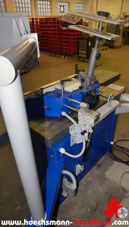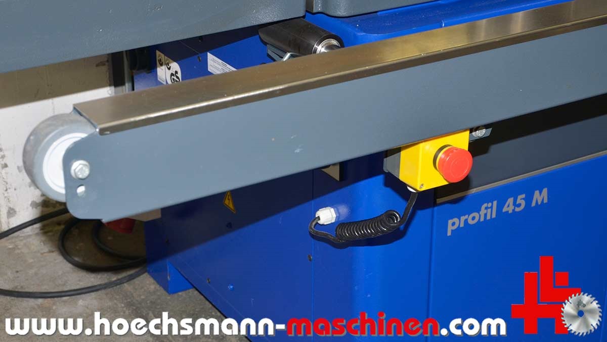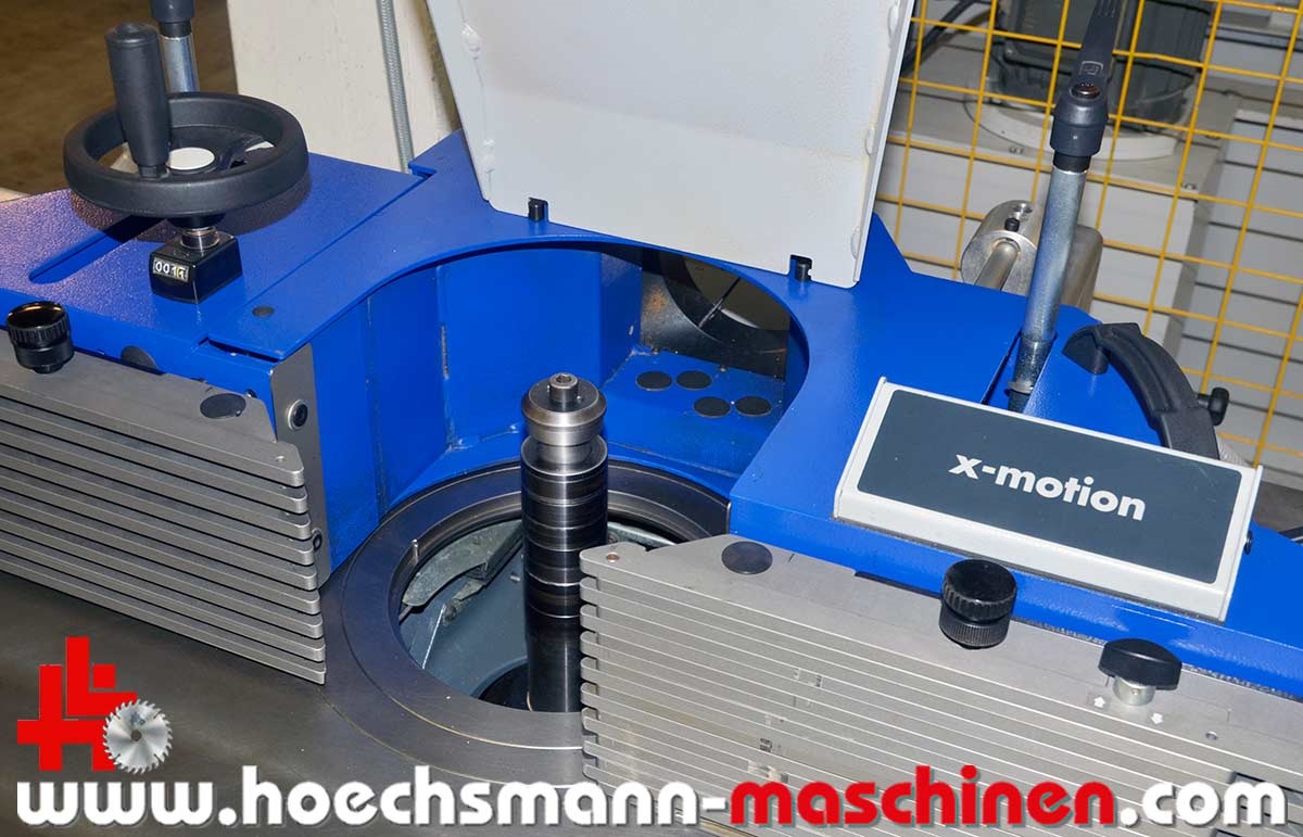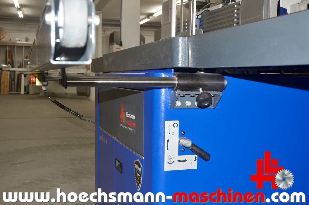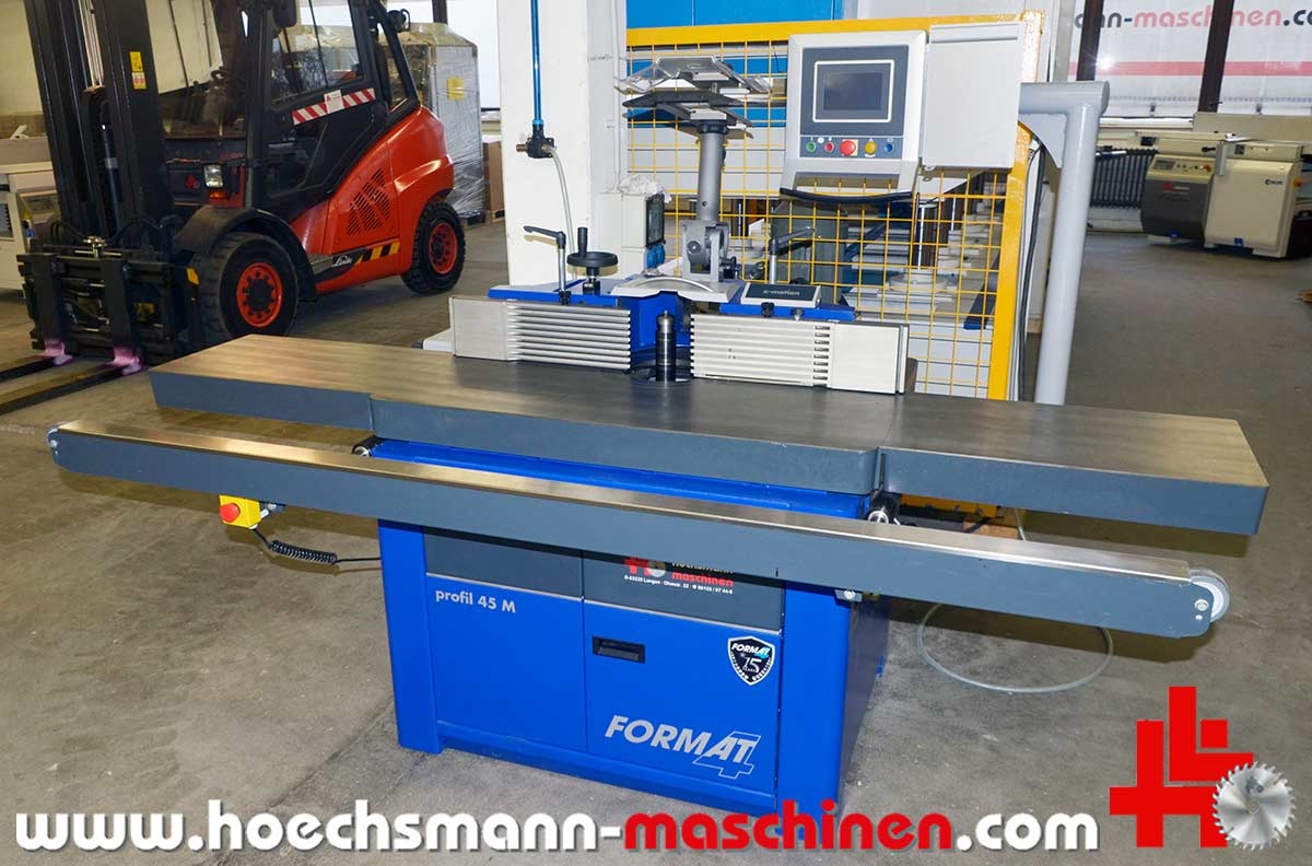 FORMAT4 swivel milling machine Profile 45 M x-motion, built in 2015, CE Sign, incl. integral stop x motion milling spindle control, milling stop for max. tool diameter 250 mm, electric MULTI adjustment system, milling table opening 320 mm, milling spindle swivel 90° - 45°, electric milling spindle height adjustment, milling spindle diameter 30 mm, 140 mm working height above table, motor power 5.5 kW, speed 3.500 / 4.500 / 6.000 / 8.000 / 10.000 rpm,