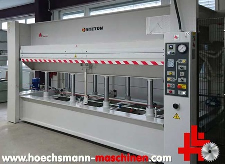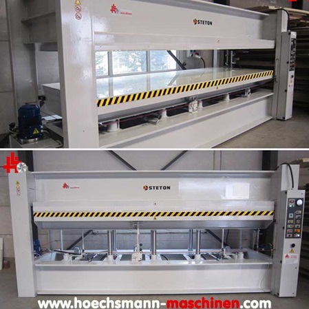 new machine, control panel with digital heating adjustment, press-automatic (Timer), electro hydraulic system, 27 kW oil heating system up to 120°, heavy steel heating plates with changeable alu surface, optional changeable mylar-surface, 8 hydraulic cylinders Ø =85 mm, CE-safety devices, usable press surface 3.000 x 1.400 mm, opens more than 450 mm, …