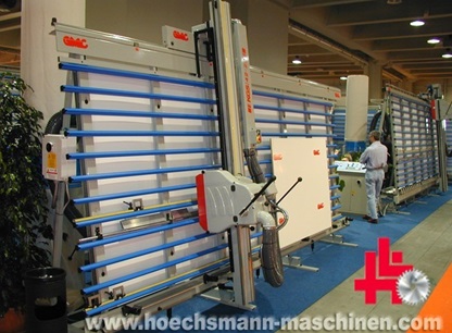 GMC panel saw vertical, type KGS 42-22 e-VN, new machine, CE-sign, rear full enclosure, cutting area 4.200 x 2.200 x 50 mm (cutting width x cutting height x cutting depth), saw blade Ø=250 mm, complete with scanning, counter-rotating NUT and scoring unit, pneumatically controlled, digital displays in both axes, suction hood, incl. 1 saw blade, control on saw carriage, reinforced motor (4 kW), with folding fences and aluminum center support, yielding slatted base for horizontal cuts, retractable rollers in base support, new condition, exhibition machine ready for demonstration, with scoring unit and grooving unit (back walls)