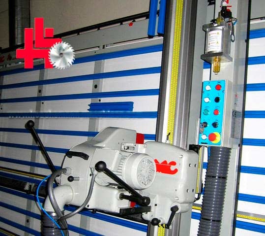GMC panel saw vertical, type KGS 52-22 eV, digital fully automatic, >ALU or plastic<, new machine, CE-sign, fully automatic cutting sequence (horizontal and vertical), minimum spray cooling pneumatically controlled, electronic digital displays, rear full enclosure, cutting area 5.200 x 2.200 x 50 mm, saw blade Ø=250 mm, complete with scanning, counter-scoring unit, suction hood, incl. 1 saw blade, control on saw carriage, reinforced motor (4 kW), with folding stops and aluminum center support, evasive slatted grid for horizontal cuts, retractable rollers in basic support, machine extended in special design (cutting length approx. 5.200 mm).