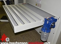SCM wide belt sander, type DMC SD 60 RCS 135, new machine, CE sign, sanding width 1.350 mm, 2 sanding aggregates, 1. roller aggregate "R" with inclined ribbed steel contact roller and 2. Combination unit "CS" with rubber coated pressure roller and "MESAR" elastic link sanding shoe, digital display, control type Logic SC, motor 18.5 kW, contact rollers and sanding shoe controllable from the console, long support tables front and rear with 5 rollers each, carpet feed with 2 speeds 4, 5/9 m / min, automatic carpet centering, abrasive belt wear optimizer by micro sensor at carpet infeed with 5 LED signal device, electronic adjustment of working height, working height 4-170 mm, door with viewing window on setup side with LED interior lighting